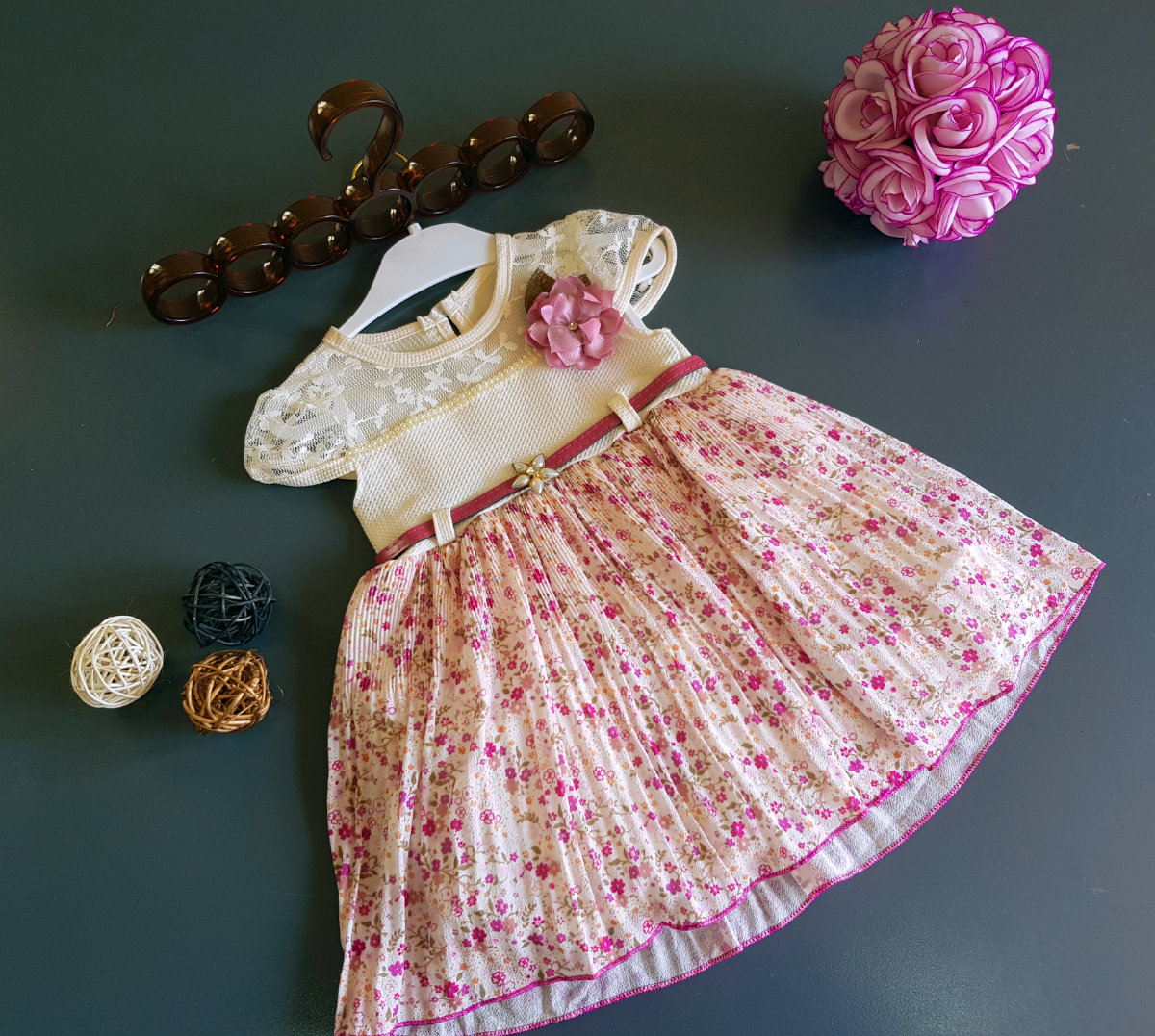 One piece dress with grape coloured floral print on bottom. Upper part as beautiful bead work and a clip-on flower over a base of lace netting. A grape coloured belt with a beaded flower completes the waistline.