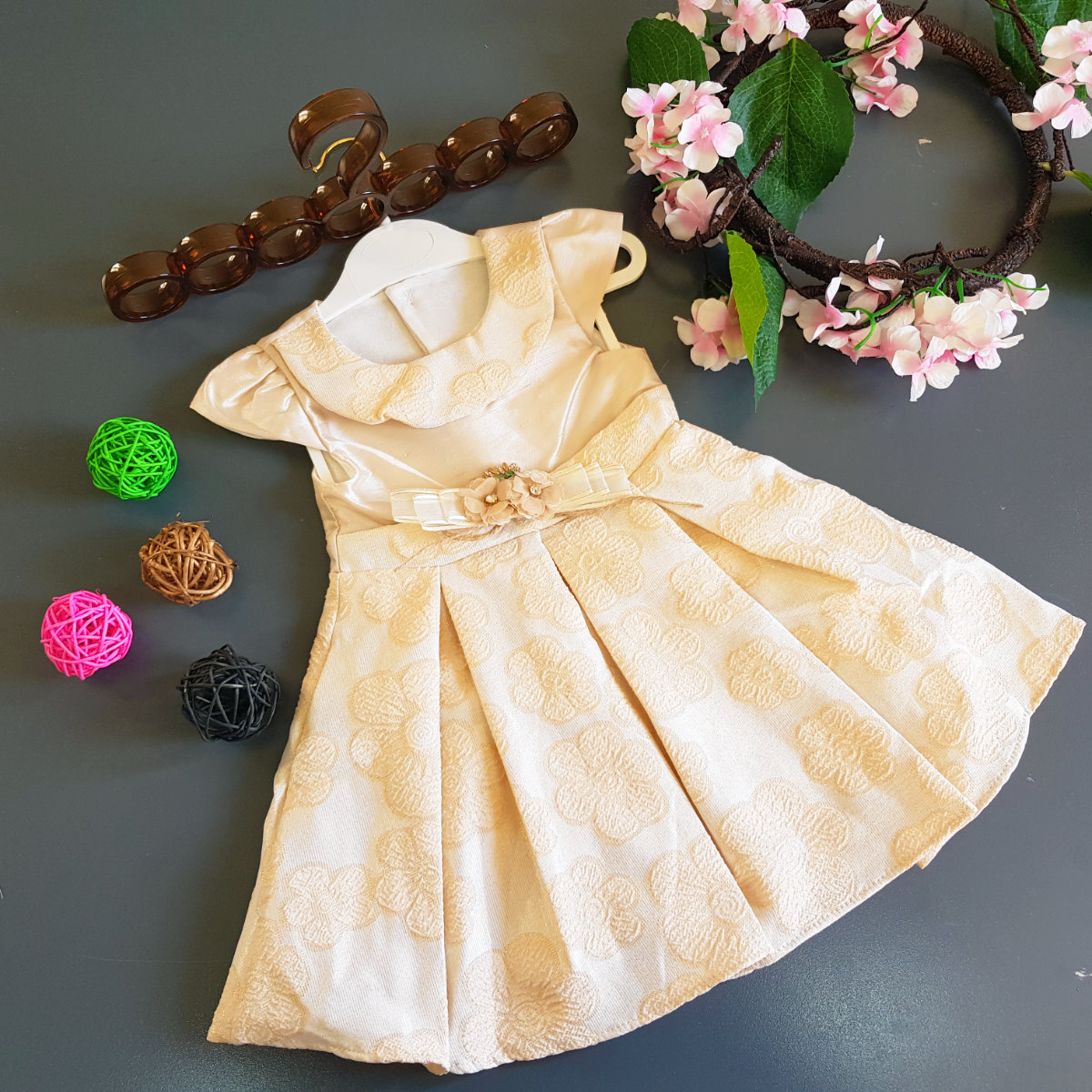 Beautiful cream dress with silk type top material and clip-on bow for the waist. The flower pattern is embossed and has good inlays.A layer of netting and inner petticot gives the flare to the dress.