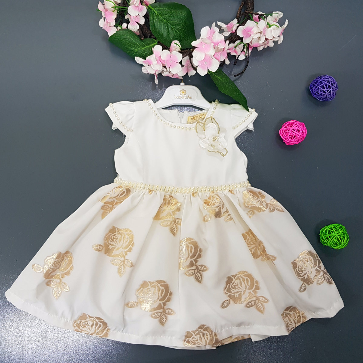 Beautiful one piece dress with bead work on the neckline and sleeves. Rustic gold embroidered roses on backdrop of simple white material. 2 layers of lining for comfort.