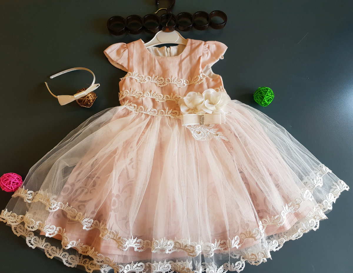 Light peach dress with beautiful embroidery. The outer layer is net material which has been embroidered allowing you to see the inner layers which have a different pattern of embroidery on it. 4 layers of lining allows the dress to flare out. An accessory hair band is included.