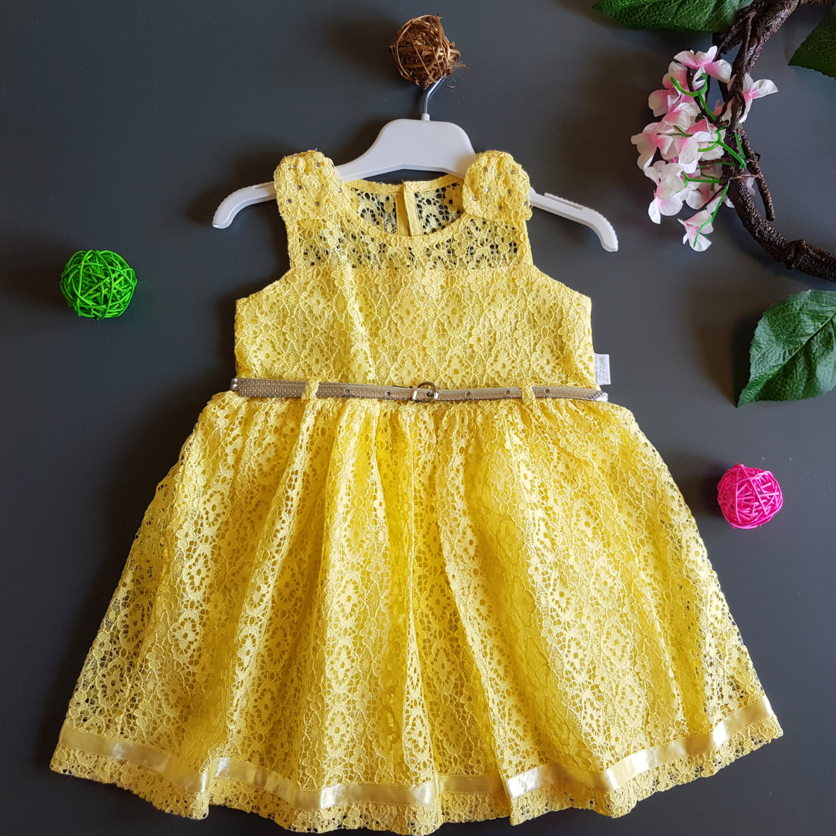 Beautiful sleeveless fully embroidered baby yellow dress with a simple silver belt to accentuate the waist.