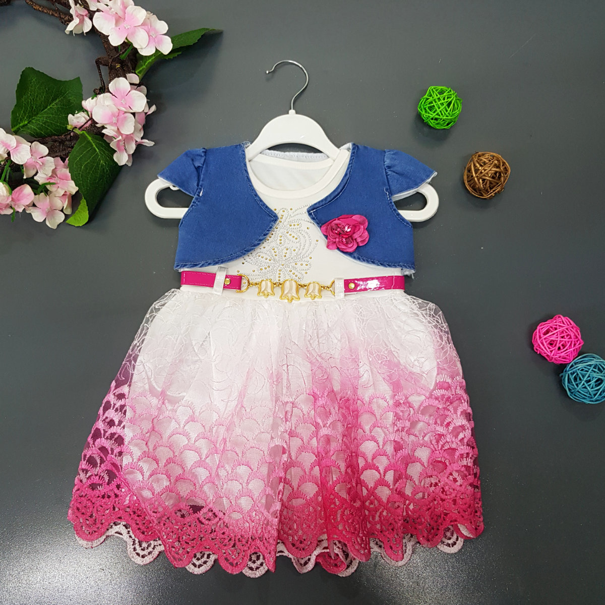 An elegant white transitioning to pink with exquisite embroidery and stone work. A removable bolero for late evening wear and a layer of lining for comfort.
