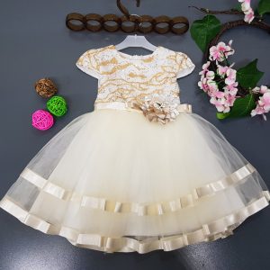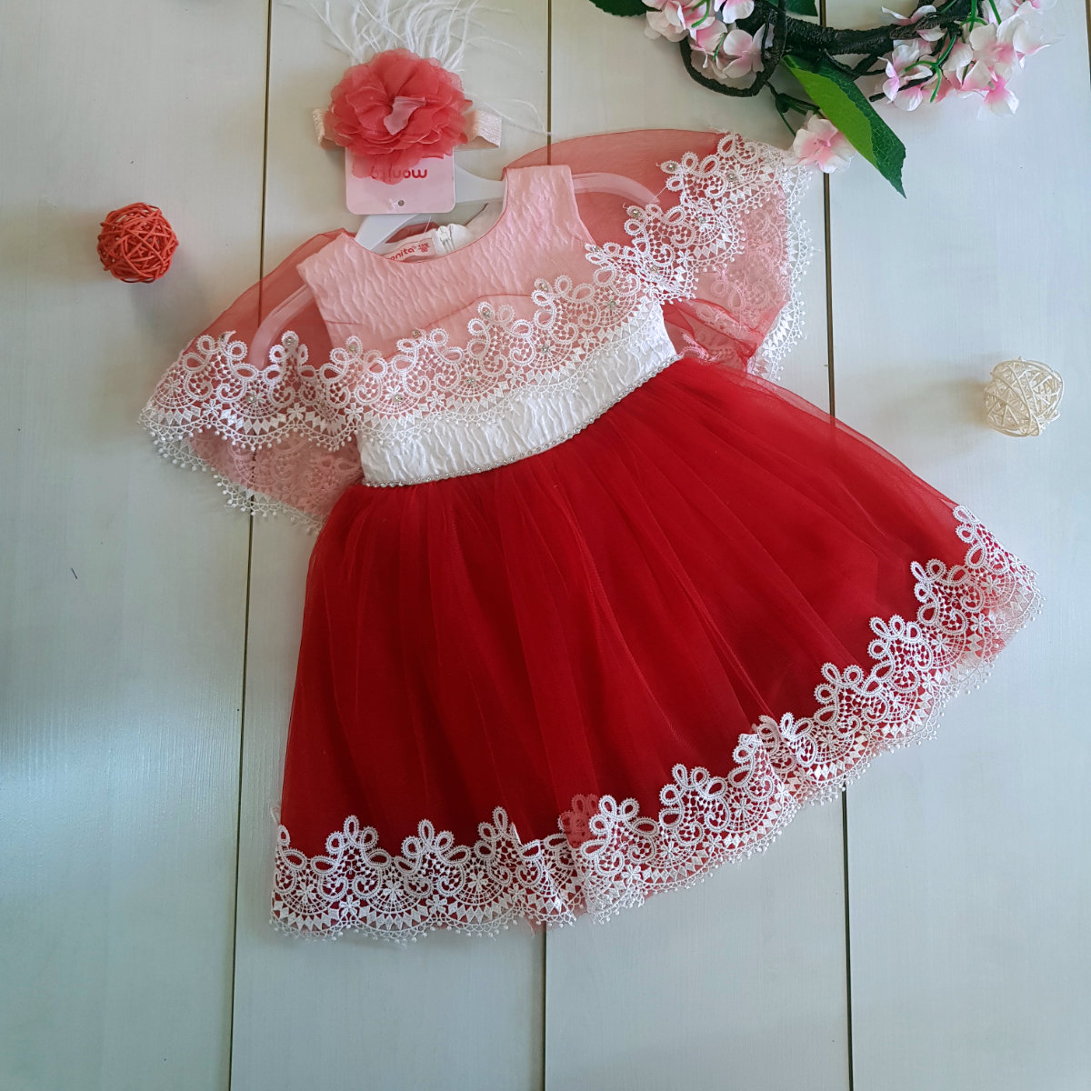Premium quality chilly red net dress with contrasting white embroidered work. 5 layers of lining protect your babies skin and enhances the look of the outfit. It comes with a complementary head band.
