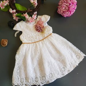 Elegant baby pink lace dress with embroidered lace on the lower part. It has soft layers of lining adding to the frill effect.