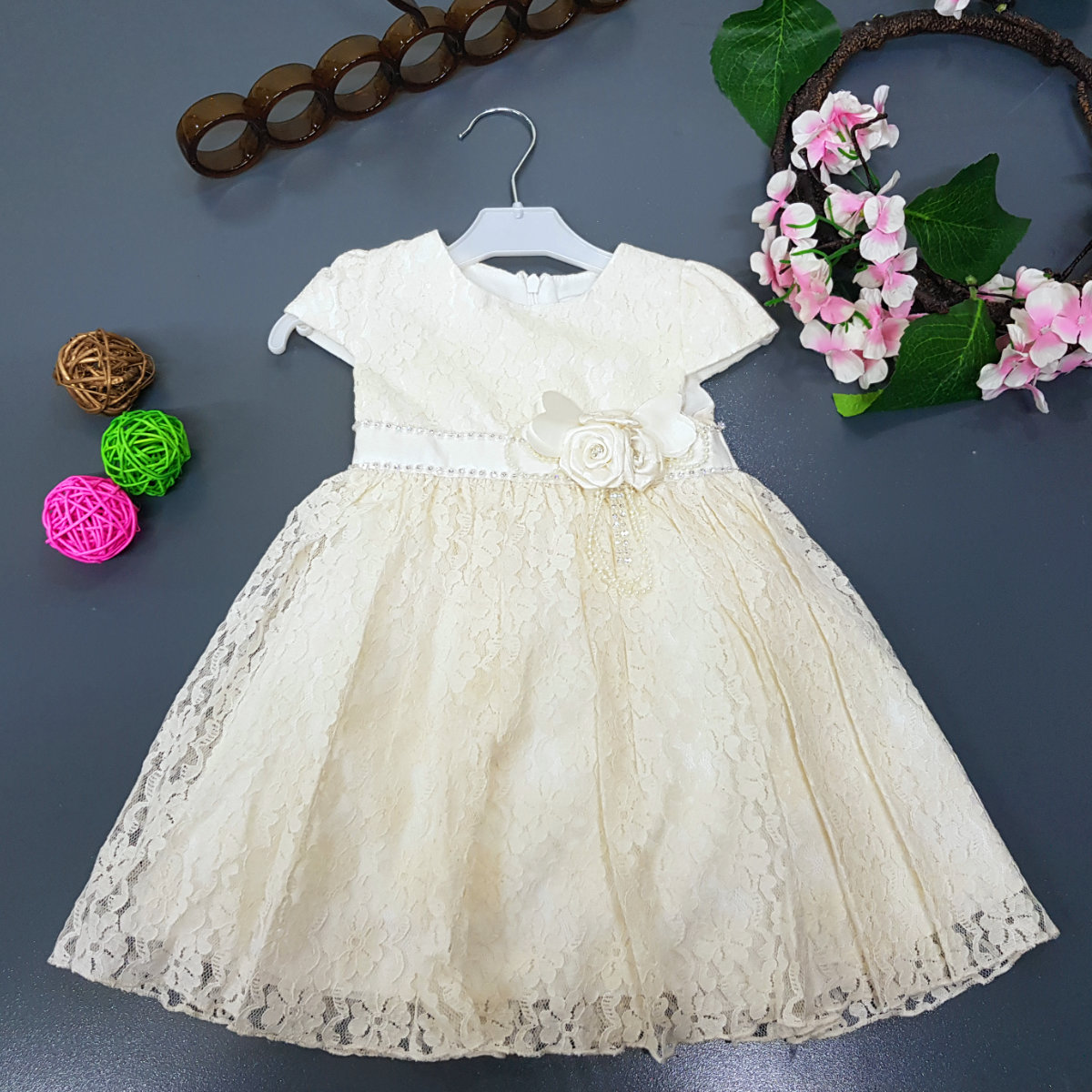 Extravagenttly embroidered lace over a layer of satin type material and an additional 2 layers of lining to give flare and comfort to the baby. A simple brooch on the waistline