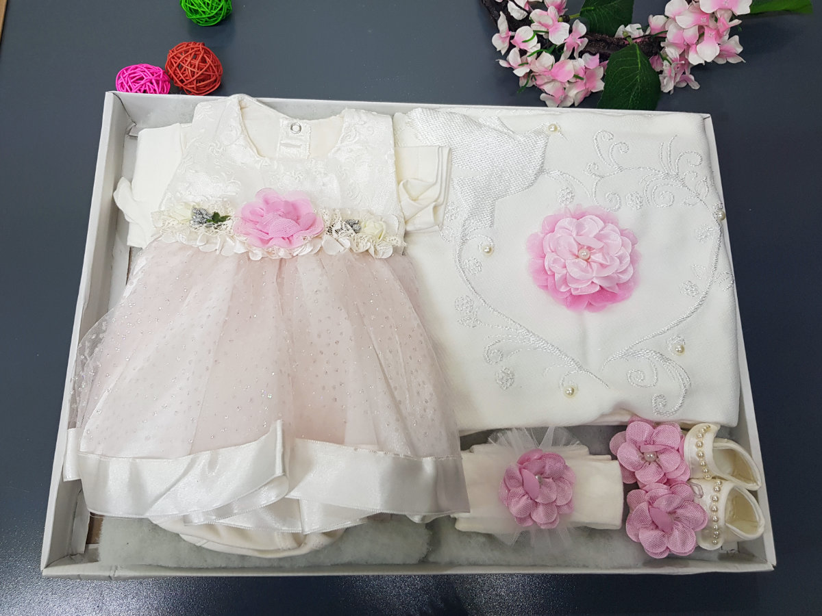 The ultimate gift for the new born. 8 piece set that can also be used for christening occasions. 1) beautiful dress with embroidery on the bodice and glitter imbued lace on the bottom with many layers of soft lining. 2) thick baby blanket in a matching pattern 3) 2 identical onesie vest with gorgeous stonework on the chest.4) leggings to keep baby warm 5) matching pair of shoes 6) matching soft headband