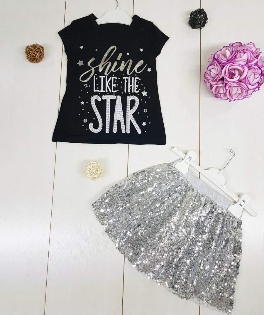 2 piece set: a simple black top with stone work to give it a touch a elegance. A stary skirt with heavy soft sequined work over a layer of lining that is very soft to the touch.