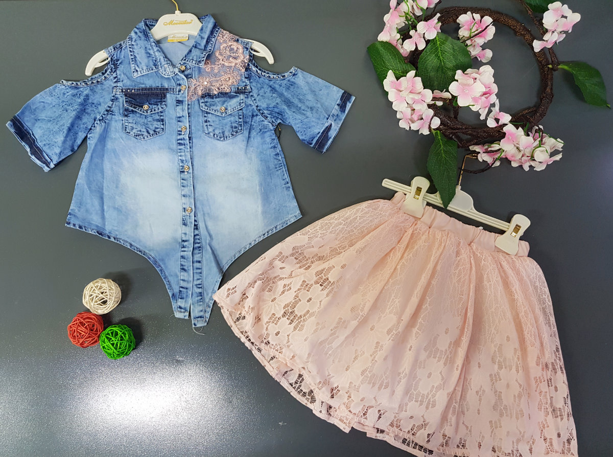 2 piece: the upper is a stone wash denim pattern top with a touch of peach embroidery on the shoulder. The skirt is fully embroidered in peach colour with 3 layers of inner lining to give it a flared look.