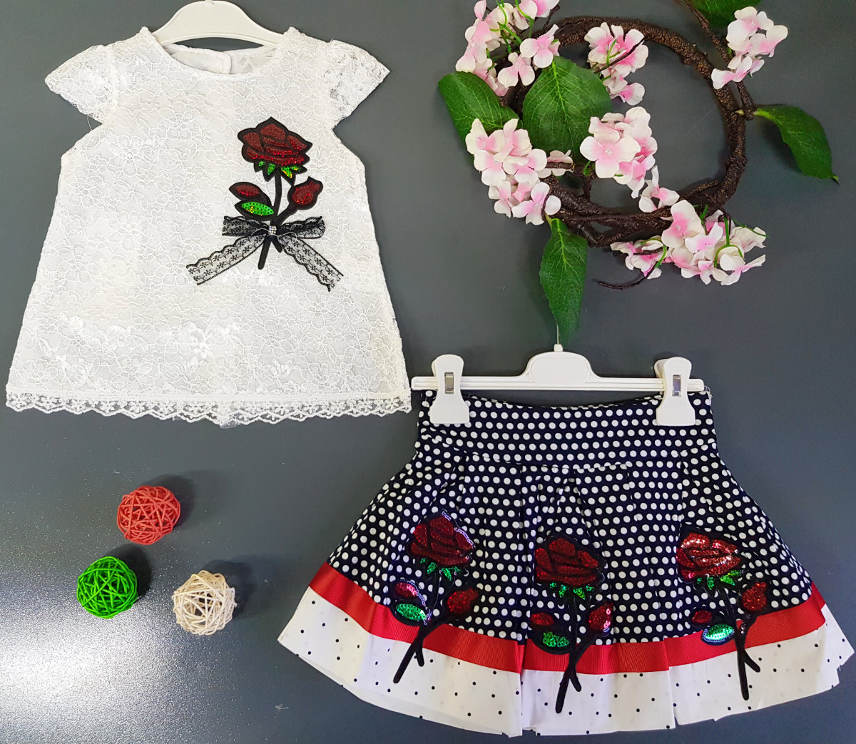 2 piece: the top is beautifully embroidered on the back and front with exquisite work of sequins in the design of a rose. Bottom: polka dot skirt with heavy sequined design perfectly stitched on.