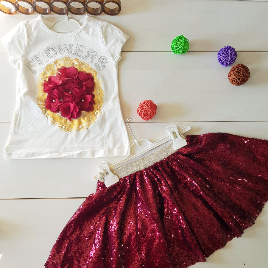 This 2 piece dress would suit a birthday baby giving her a ballerina look. The simple white top is punctuated with a spot of stone work and a floral design. The burgundy coloured skirt has a soft inner lining that protects the babies skin from the extravagent sequined work.
