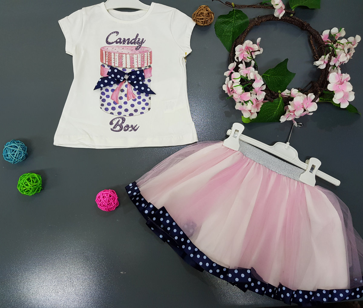 2 piece set: candy themed print with a splash of stonework for glitts and glamour. Skirt in candy pink with 3 layers of lining for added comfort.