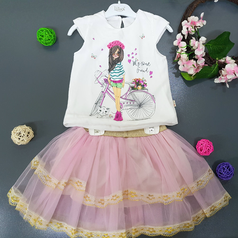 2 piece: the top in plain white with a beautiful print perfect for a Sunday afternoon. A baby pink net skirt with 3 layers of inner lining to give it a nice flare.