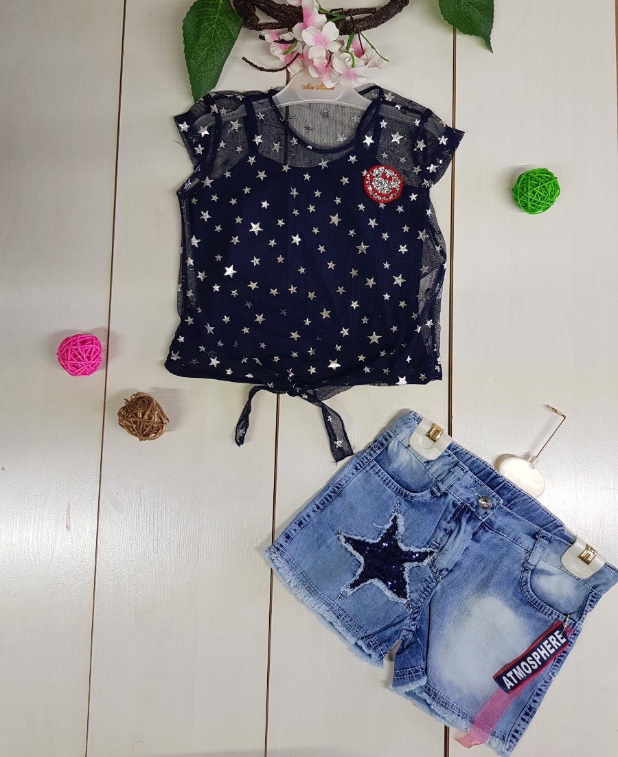 2 piece: top is made of 2 pieces, the outer netting has beautiful silver stars printed on it with and an inner vest for the child’s comfort. Bottom denim short with sequins in a star pattern