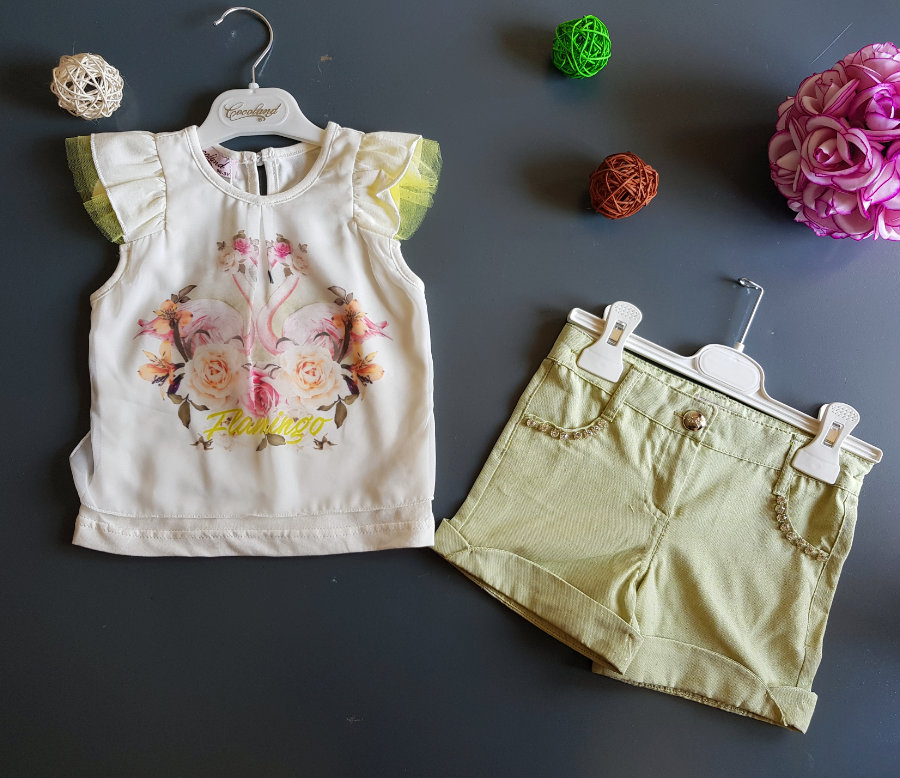 2 piece set: top has a beautiful floral print on soft chiffon material stitched onto an inner vest. Bottom olive green shorts with stone accents on the pockets