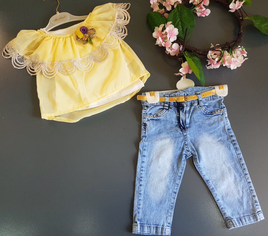 2 piece :top: baby yellow with outer terelene material with embroidered border and clip on flower. It includes an white cotton vest.
