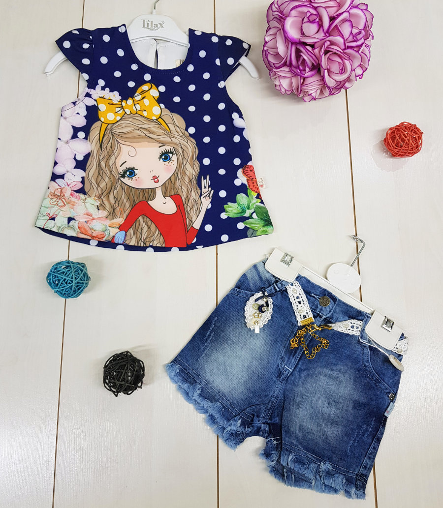 2 piece set: a beautiful printed top in navy blue polka dots. The soft thick material flows great fully on the babies body. Denim shorts with a lace belt to complete the look