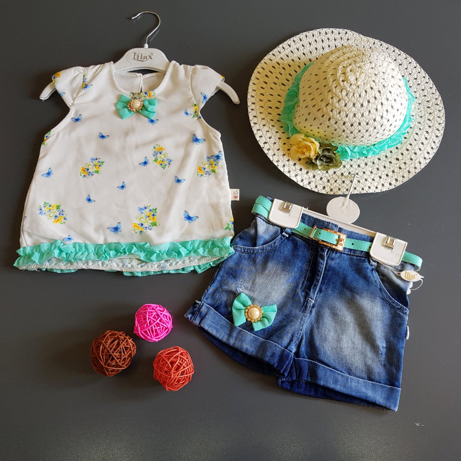 3 piece:summer hat with turquoise border . Top: soft crepe type material and inner lining with crepe material,turquoise piping at the bottom and printed butterflies on the top. Bottom: denim short with turquoise ribbon and belt.